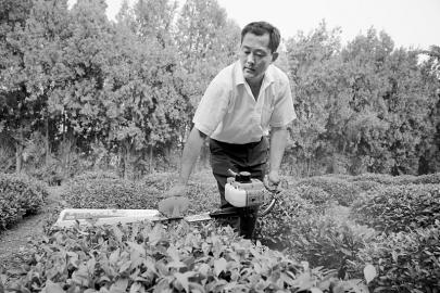 7月13日,工作人员在省级现代农业示范区莒县浮来青生态茶园内进行茶园管理,浮来青茶在 5月份举办的中国国际有机食品博览会上代表日照绿茶被评为金奖。